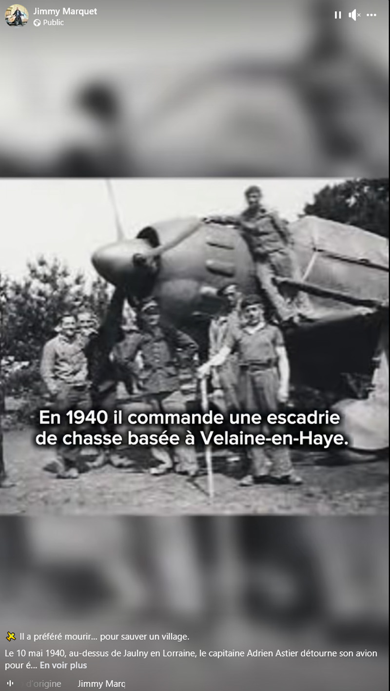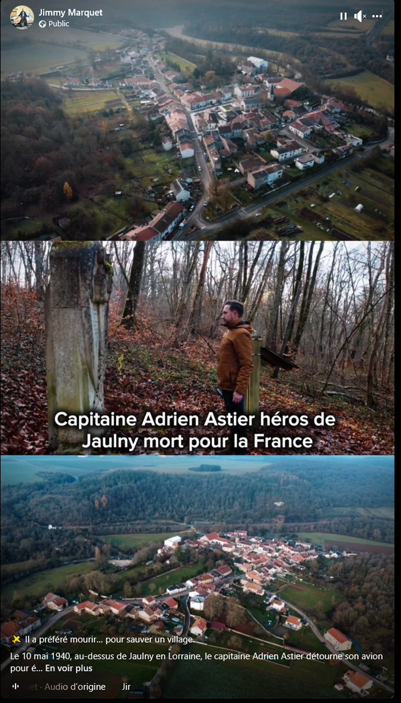 Source, France – Crashes 39-45 : http://francecrashes39-45.net/page_fiche_av.php?id=2910 A bord de son Bloch 152 N°545, le Capitaine Adrien ASTIER a probablement été abattu par Wolfgang LIPPERT, qui le 15 mai 1940, à Monthermé, revendique deux Bloch à lui seul. Jimmy Marquet, Facebook, le 1er décembre 2025 : « Il a préféré mourir… pour sauver un village. Le 10 mai 1940, au-dessus de Jaulny en Lorraine, le capitaine Adrien Astier détourne son avion pour éviter qu’il ne s’écrase sur le village. Il sacrifie sa vie pour sauver celle des autres. Un héros trop peu connu de l’histoire française. Cette vidéo raconte son acte incroyable — un moment oublié de la Seconde Guerre mondiale, ici, en France, en Lorraine. Les héros ne disparaissent que lorsque l’on cesse de les raconter. » https://www.facebook.com/reel/2733565006985635
