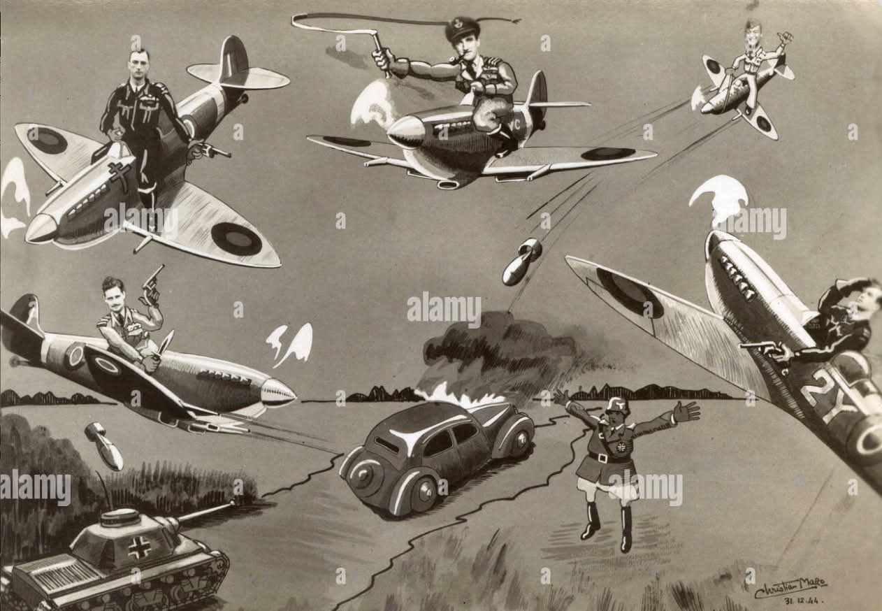 PINON (1915-1944) https://docplayer.fr/9685951-Roger-pinon-1915-1944.html Le Spitfire MK IX N°959, piloté par Christian MAZO, en juin 1944 Croquis des pilotes de ses officiers d'escadrons Spitfire Un sketch amusant du pilote Christian Mazo des officiers de sonescadron Spitfire, bombardant ludiquement un malheureux allemand. Le329e Escadron semble avoir des connexions avec le Free French (note livrée). Date : 1944