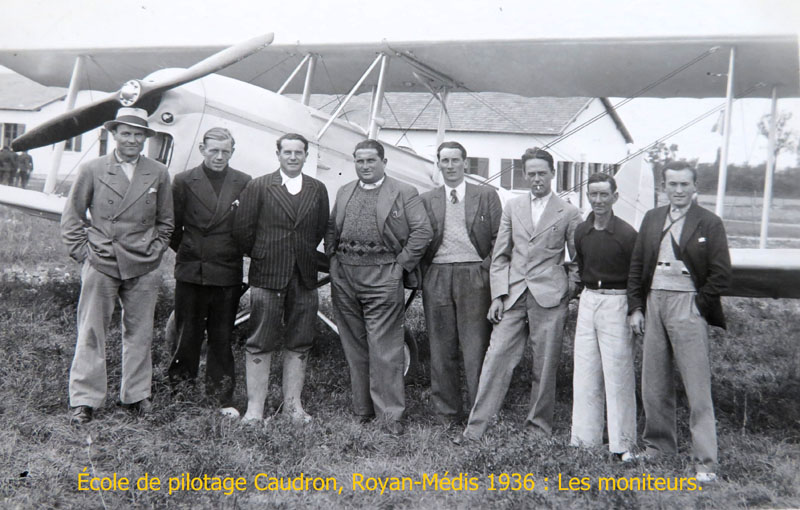 En 1934 : école Caudron de Royan-Médis (Charente-Maritime) : Extrait du récit de Pierre Patoor : "Un amour de locomotive" : "Lien" … « A dix-sept ans et demi, je suis entré à l’école d’aviation de Royan, pour faire mon service militaire. Près de 3000 autres jeunes collégiens suivirent le même chemin. On nous avait accueillis dans des bâtiments tout neufs, sur le petit terrain de Royan-Medis où, pendant un an, nous nous sommes préparés au Brevet de pilote. Nos moniteurs se donnaient beaucoup de mal et nous étions très heureux de constater nos progrès réguliers. L’ambiance aéronautique s’accompagnait d’exercices militaires. Plusieurs pistes d’atterrissages étaient installées dans la campagne autour de Royan. Ces pistes, très courtes, devaient nous permettre de nous entraîner aux atterrissage extrêmement courts, condition indispensable pour le genre de mission qui nous seraient demandées. Les appareils Caudron commençaient à sortir des usines. L’examen final nous donnerait le brevet de pilote militaire et nous permettrait, en fonction du classement d’être affecté dans l’escadrille de notre choix : la chasse, le bombardement ou l’observation. Mais pour cela il fallait obtenir les meilleures places, aussi bien pour les examens militaires que pour le pilotage. Pour ma part, ce fut avec une grande joie que j’appris mon affectation à la première escadre de chasse qui stationnait à cette époque à Villacoublay et au Bourget. »...