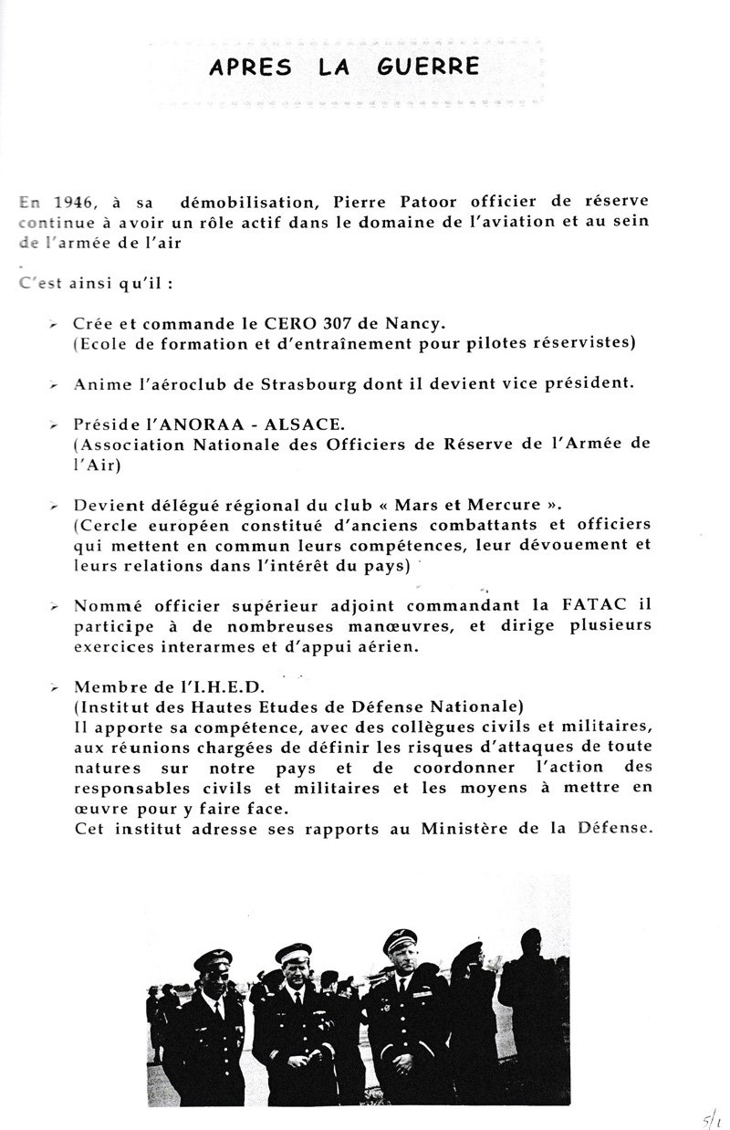 À gauche : Sauberli – à droite : Patoor Il est nommé Commandant, le 01/01/1952 Il est nommé Lieutenant-Colonel, le 01/06/1959 Les avions qu’il a pilotés : 01/02/1953 : Morane Saulnier 472 Vanneau II, Nancy-Essey BA121 https://fr.wikipedia.org/wiki/Morane-Saulnier_Vanneau 29/01/1954 : Nord 1101 Ramier, Nancy-Essey BA121 https://aviationsmilitaires.net/v3/kb/aircraft/show/1998/nord-aviation-nord-1100-noralpha 18/06/1954 : Caudron C449 Goëland, Nancy-Essey BA121 https://fr.wikipedia.org/wiki/Fichier:Caudron_C449_Goeland_1273_FAF_RWY_15.03.47_edited-2.jpg 29/06/1954 : De Haviland Vampire, Nancy-Essey BA121 https://fr.wikipedia.org/wiki/De_Havilland_DH.100_Vampire 30/06/1956 : Morane Saulnier 472 Vanneau II, Nancy-Essey BA121 https://fr.wikipedia.org/wiki/Morane-Saulnier_Vanneau