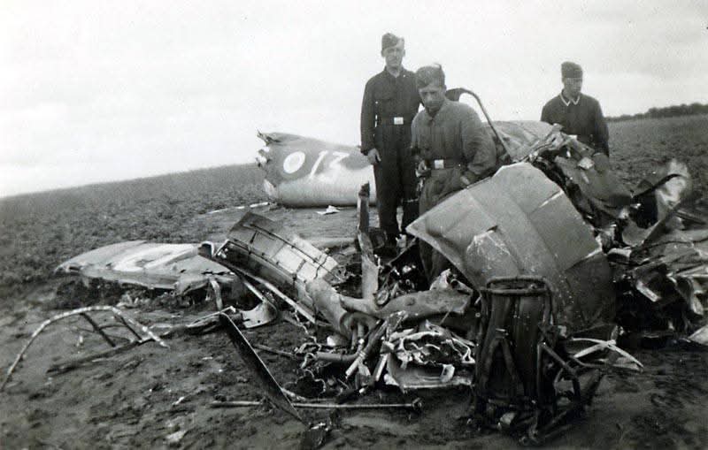 Bloch MB 152, n° 618, affecté au GC II/1, 3° Escadrille - Piloté par le Lieutenant BRUN, il sera abattu en combat aérien le 11 Juin 1940 lors d'une mission de destruction sur Château-Thierry - Isolé de son coéquipier, il est attaqué par un groupe de Bf 109 - Sévèrement endommagé, s'écrase au sol - Le pilote, blessé au menton par une balle explosive, rejoindra son groupe plus tard. Source : https://www.facebook.com/groups/AviationFrancaise1940